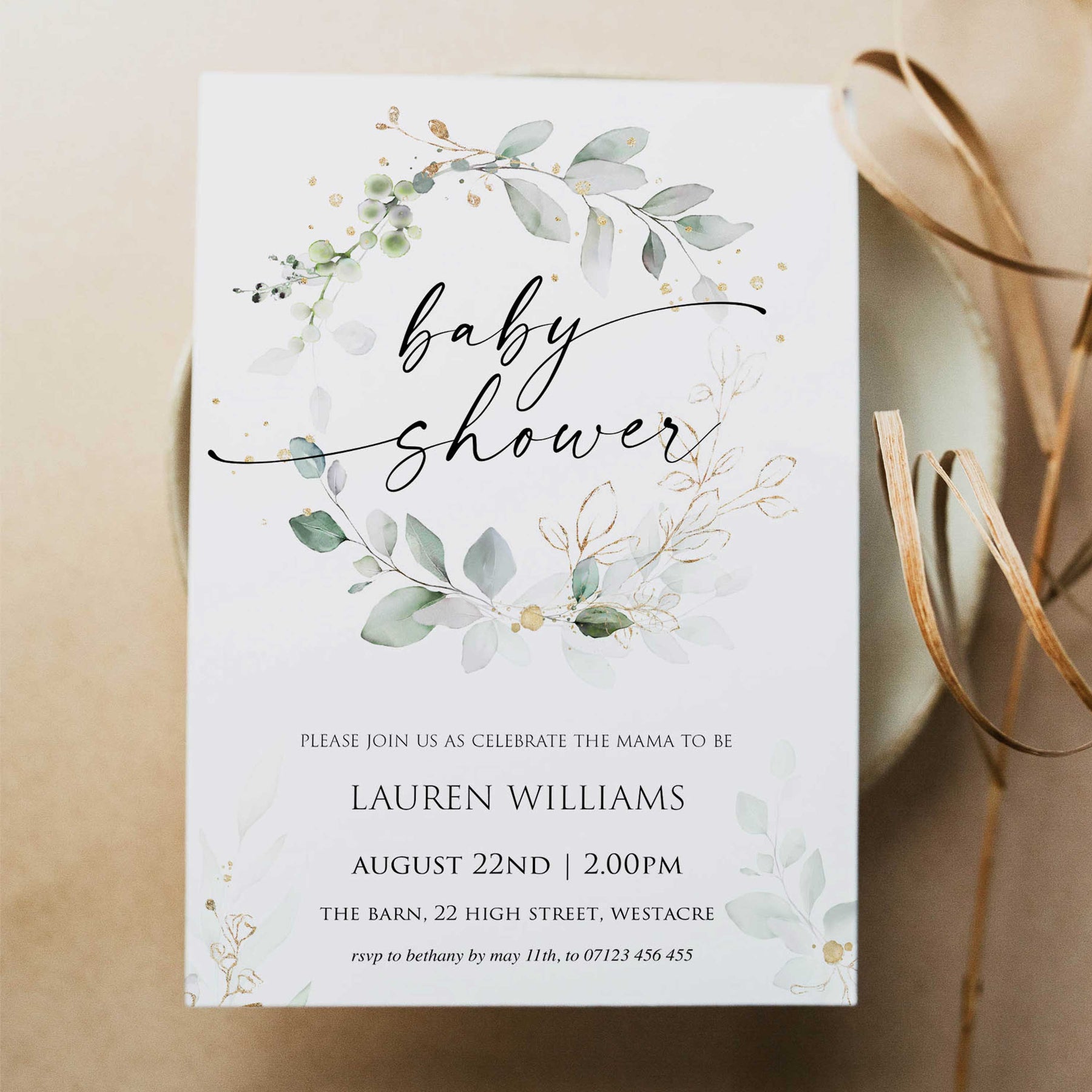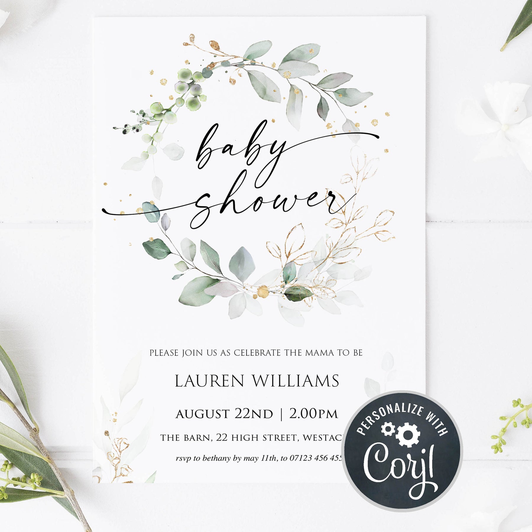 Editable Baby Shower Wreath Invitation - Gold & Green Leaf