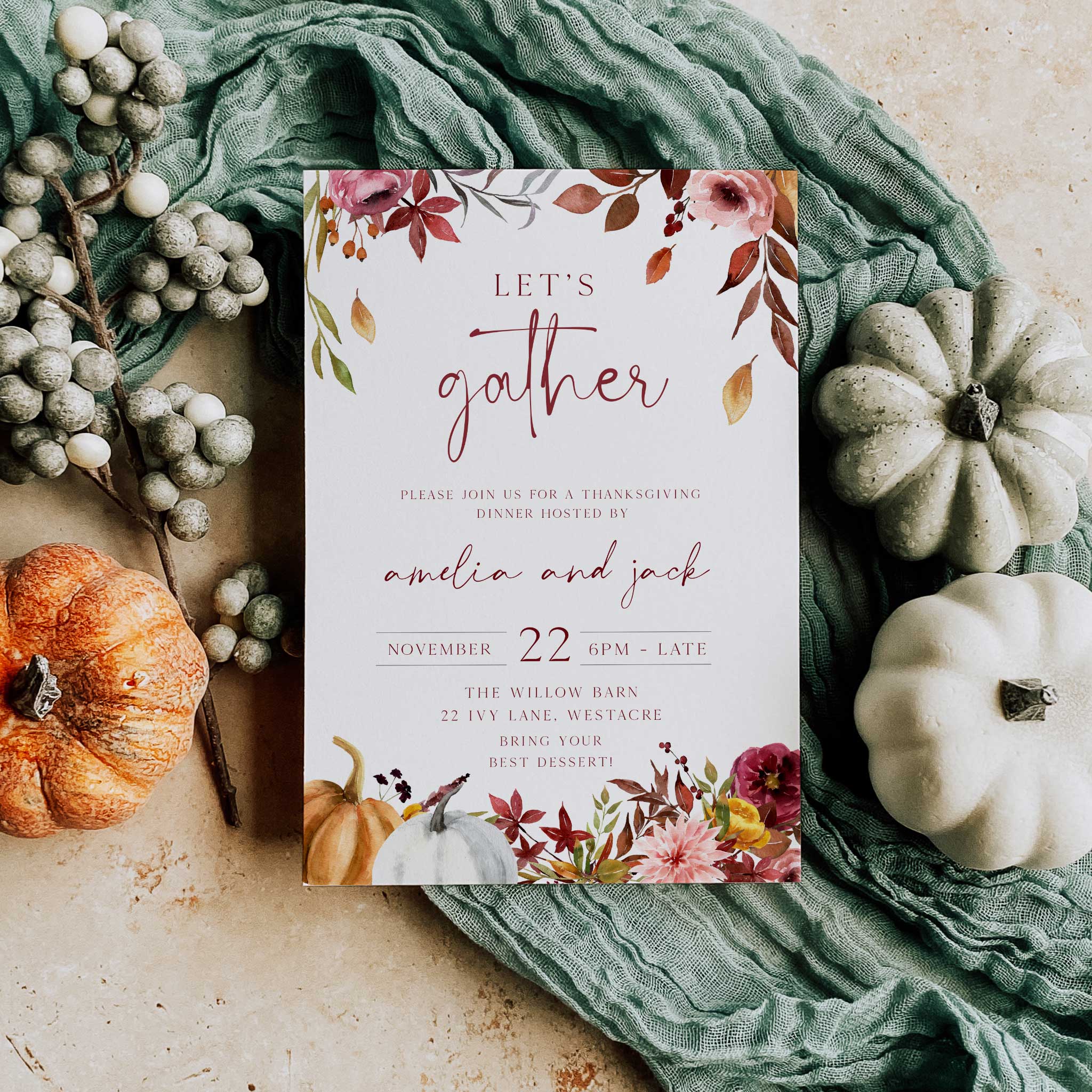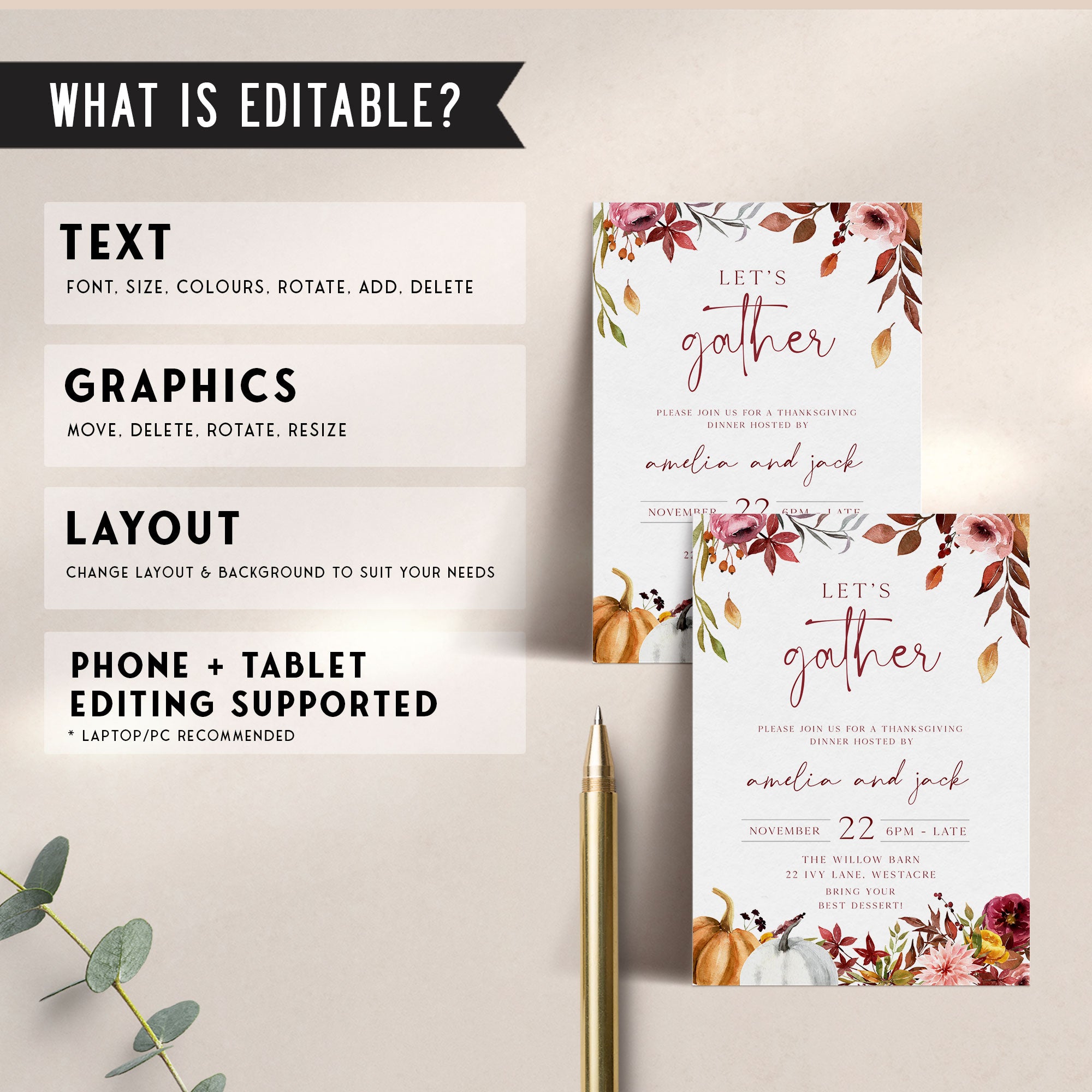 Make your Thanksgiving celebration extra special with our Editable Thanksgiving Dinner Invitation Set. Adorned with cozy autumn-themed illustrations. Customize the text to include your name, event details, and a warm holiday message. Whether you choose to print or share digitally, our versatile set offers convenience and a festive touch for any Friendsgiving or Thanksgiving gathering.
