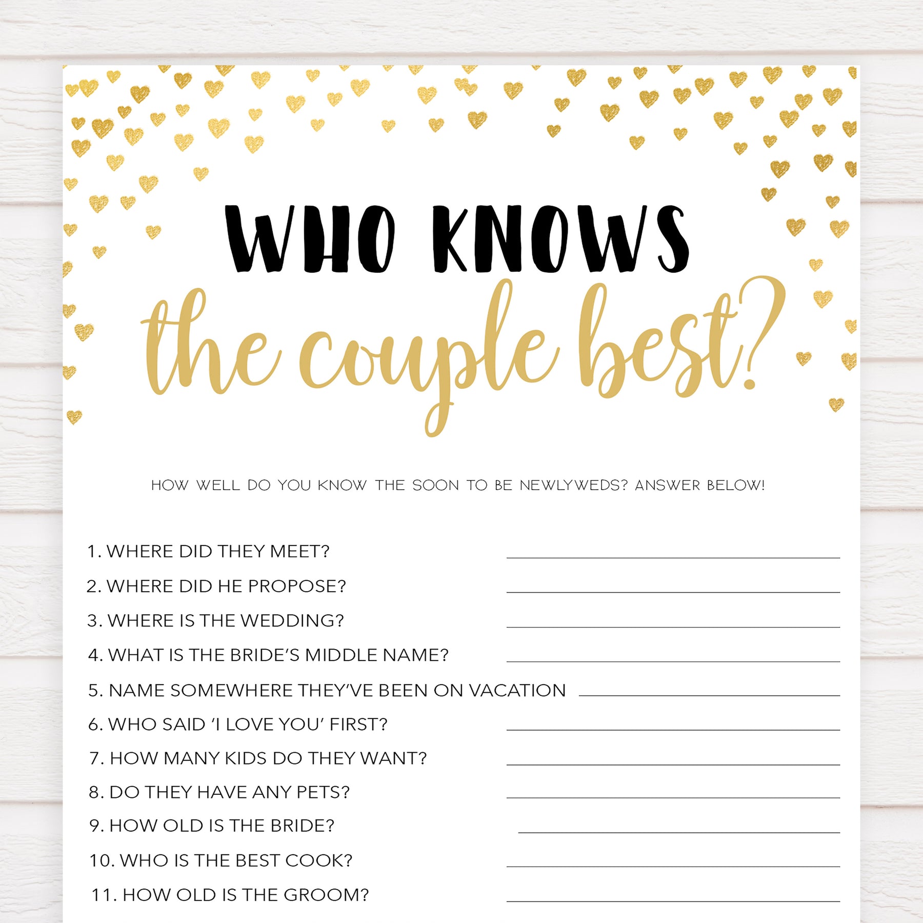 Gold hearts bridal shower games, who knows the couple best, printable bridal games, gold bridal games, gold hearts bridal games, fun bridal games, top bridal games, best bridal games