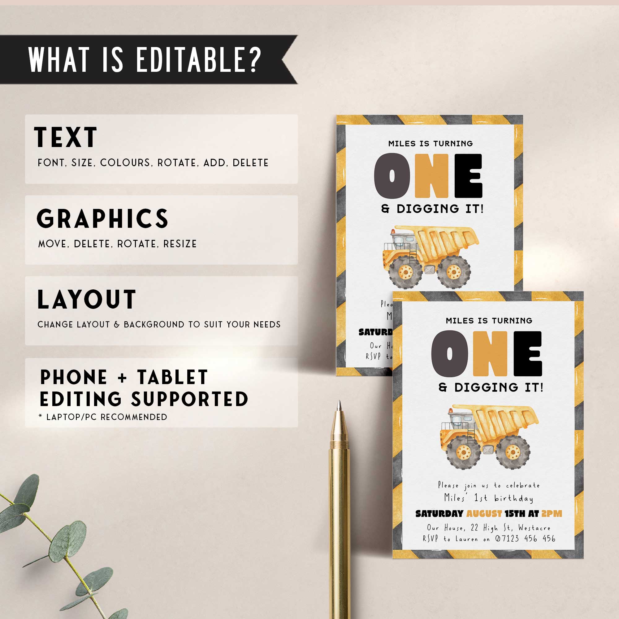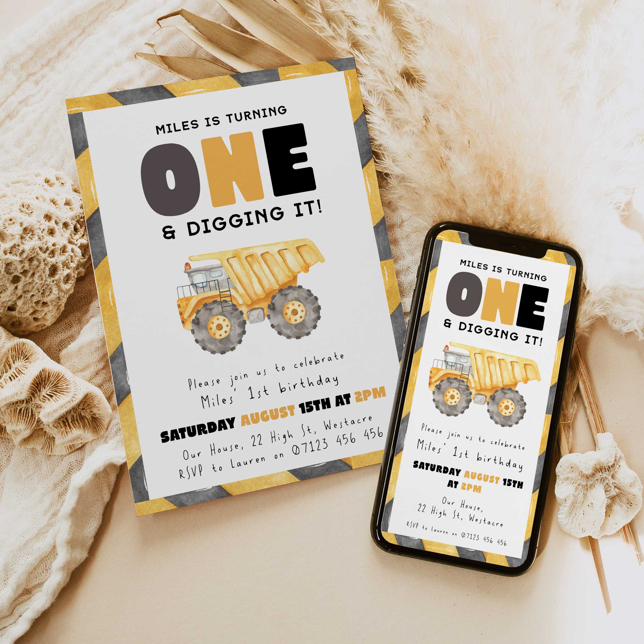 Get ready to dig into the fun! Our Little Digger First Birthday Invitation is perfect for your tiny construction fan’s big day. With construction trucks and bright digger-themed details, this editable invite set comes with a printable 5x7 version and a mobile-friendly file for easy sharing. Just add your little one’s name and party info, and you’re all set to build some birthday memories. Whether you're printing it out or sending it digitally, it's a fun and flexible way to invite friends and family to your child’s first big milestone.