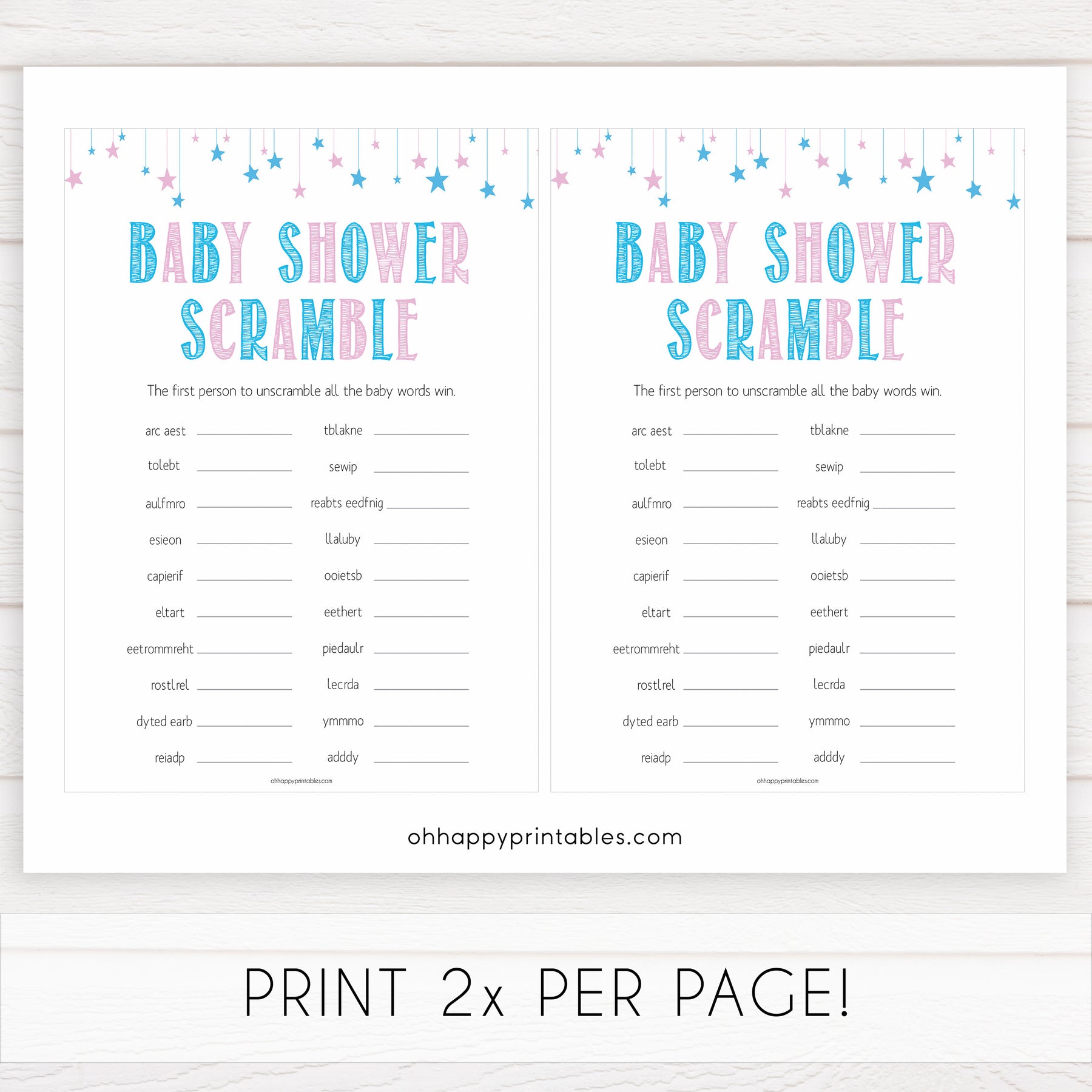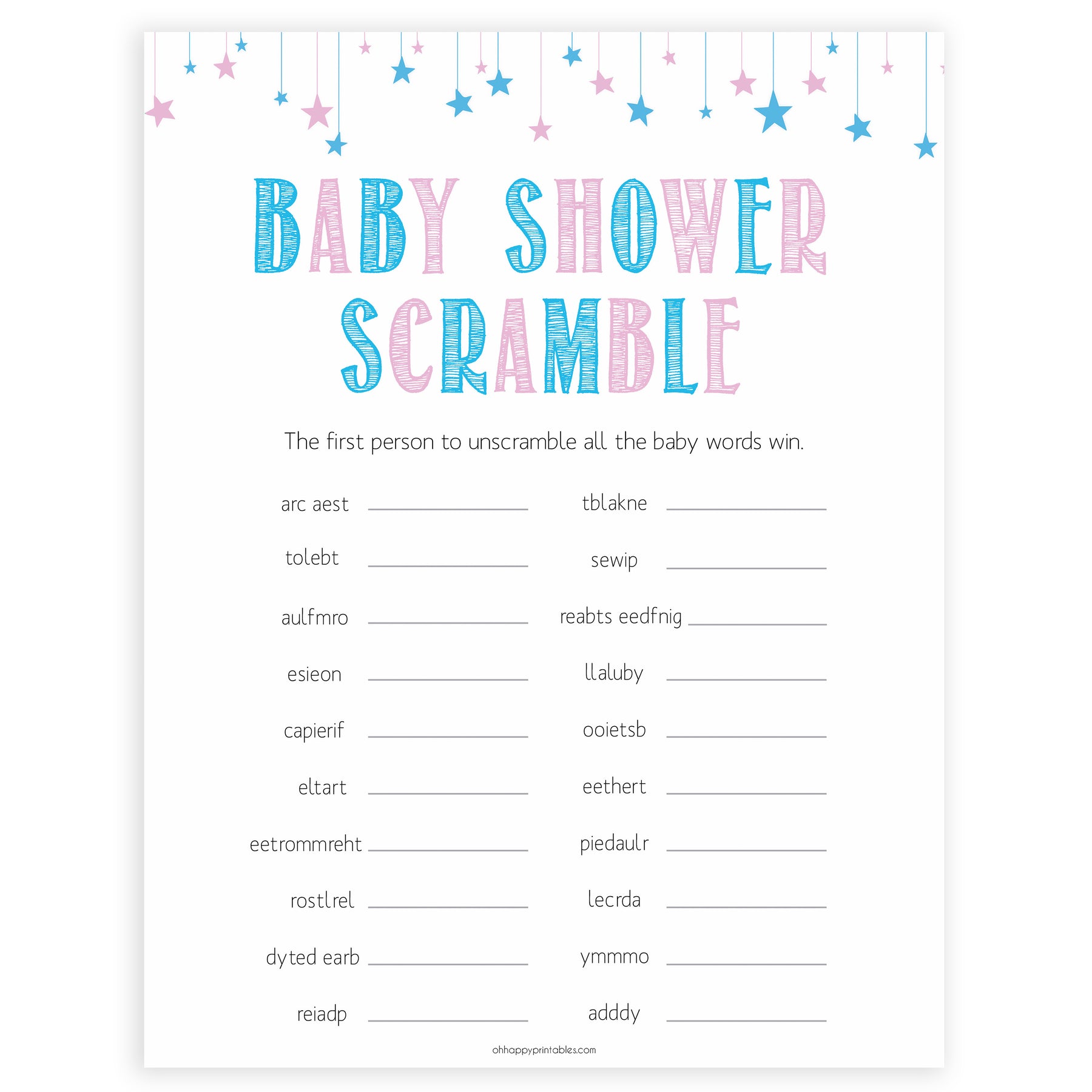 The baby word scramble game has 20 words scrambled - all the words are associated with babies and pregnancy. Get your friends to race against each other or play as a group. Download instantly and print at home for some baby shower fun.