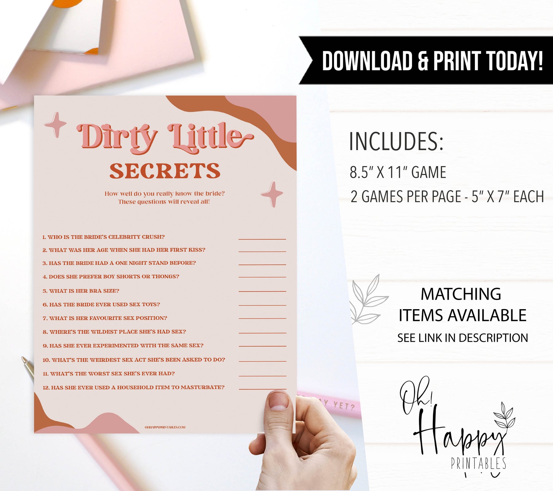 Do you really know the bride-to-be? These questions reveal a saucier side to her you might not recognise! A great game to play with your girlfriends, hearing everyone's guesses about the bride's dirty little secrets is half the fun.