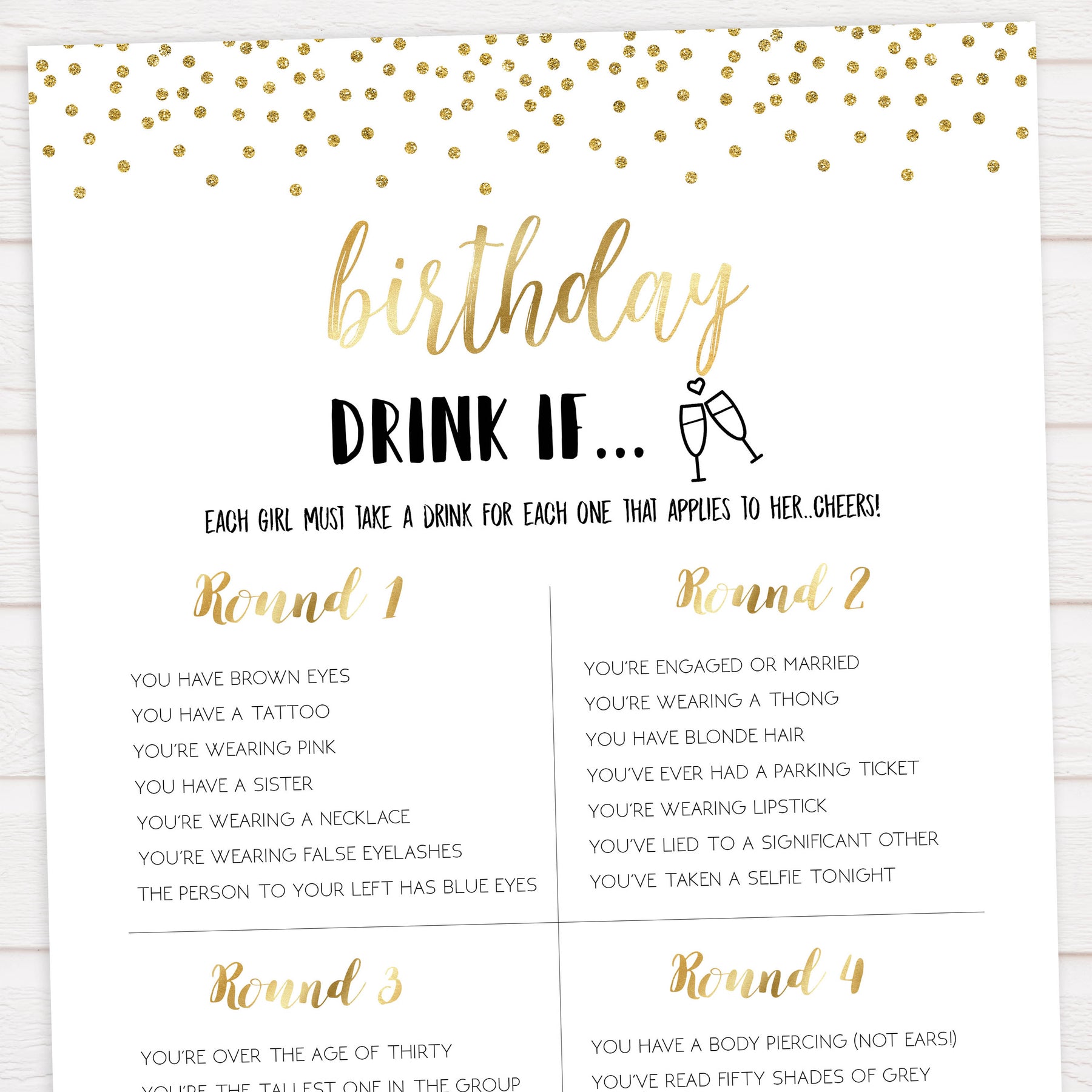 Get everyone in the mood to party with this hilarious Birthday Drink If game! Featuring a variety of fun scenarios, no one is getting away without drinking here!