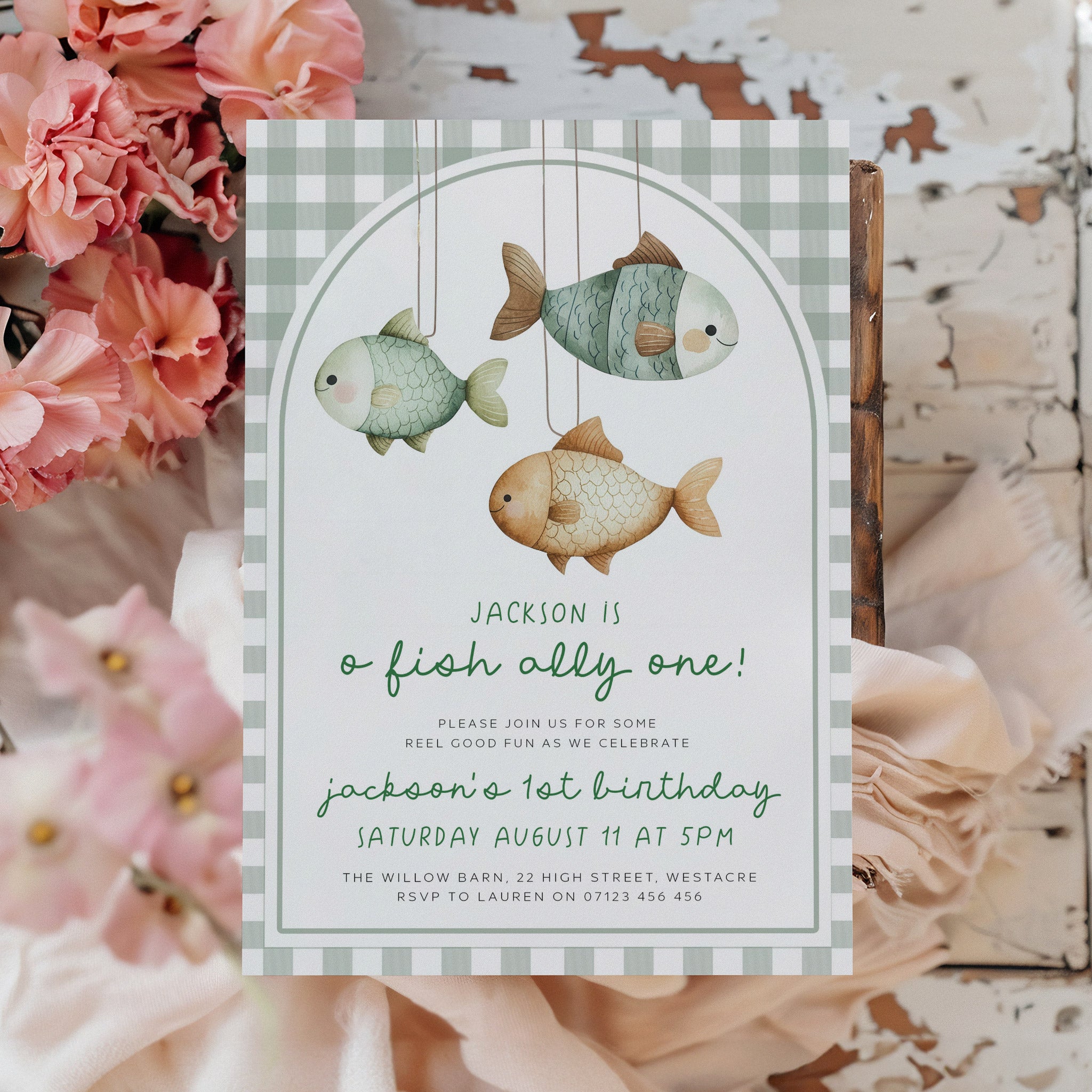 O-Fish-Ally One Gingham Birthday Editable Invitation