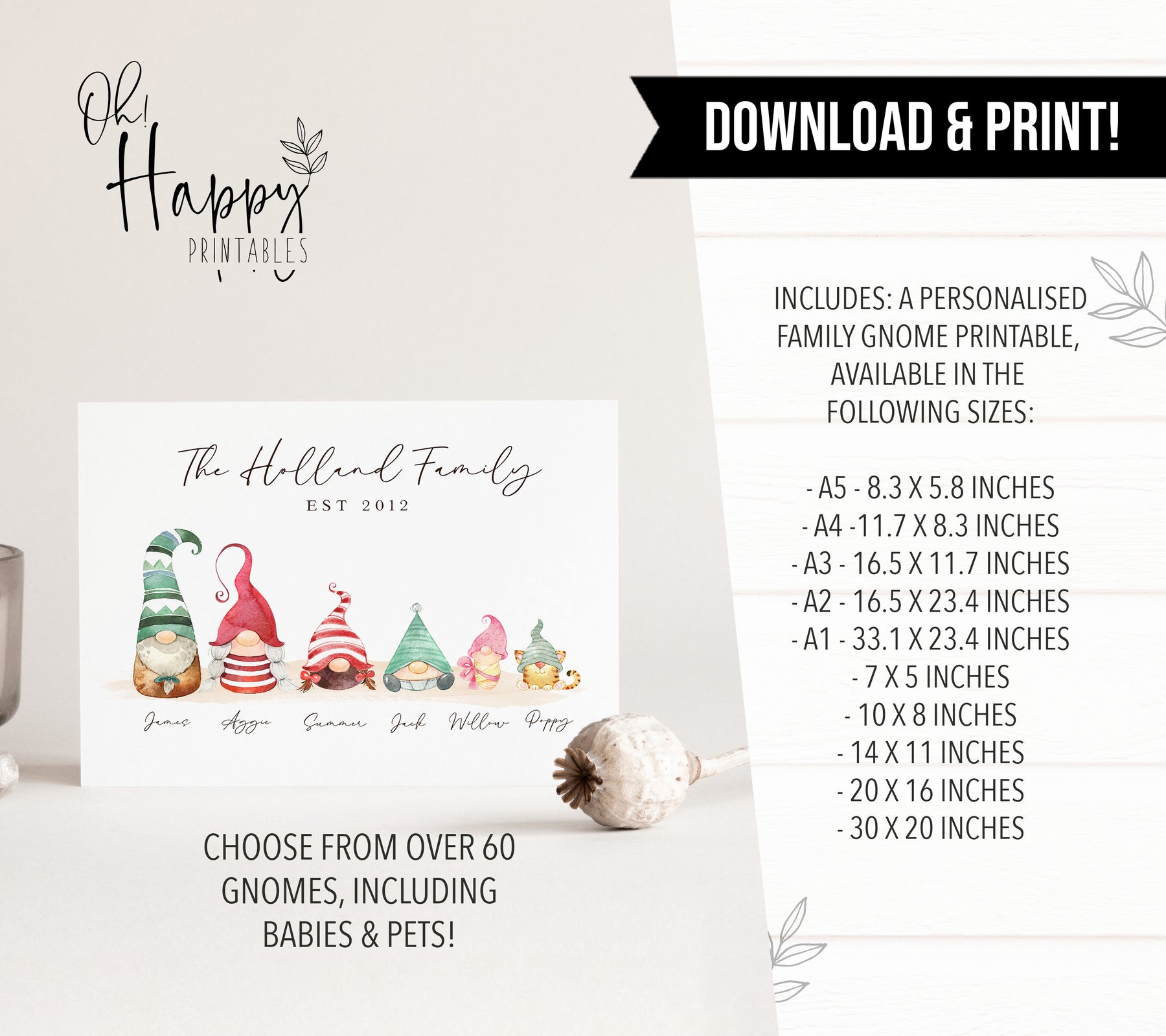 This personalised gnome family portrait printable is the perfect gift for that hard to buy for family member. Showcase your loved ones as Scandinavian Christmas gnomes, complete with babies and pets! Add it to your wall décor in the bedroom, lounge, office, hallway or anywhere special. As it's a printable download, its a great last minute gift for your girlfriend, boyfriend, wife, or husband. Simply download and print at home, it couldn't be easier.