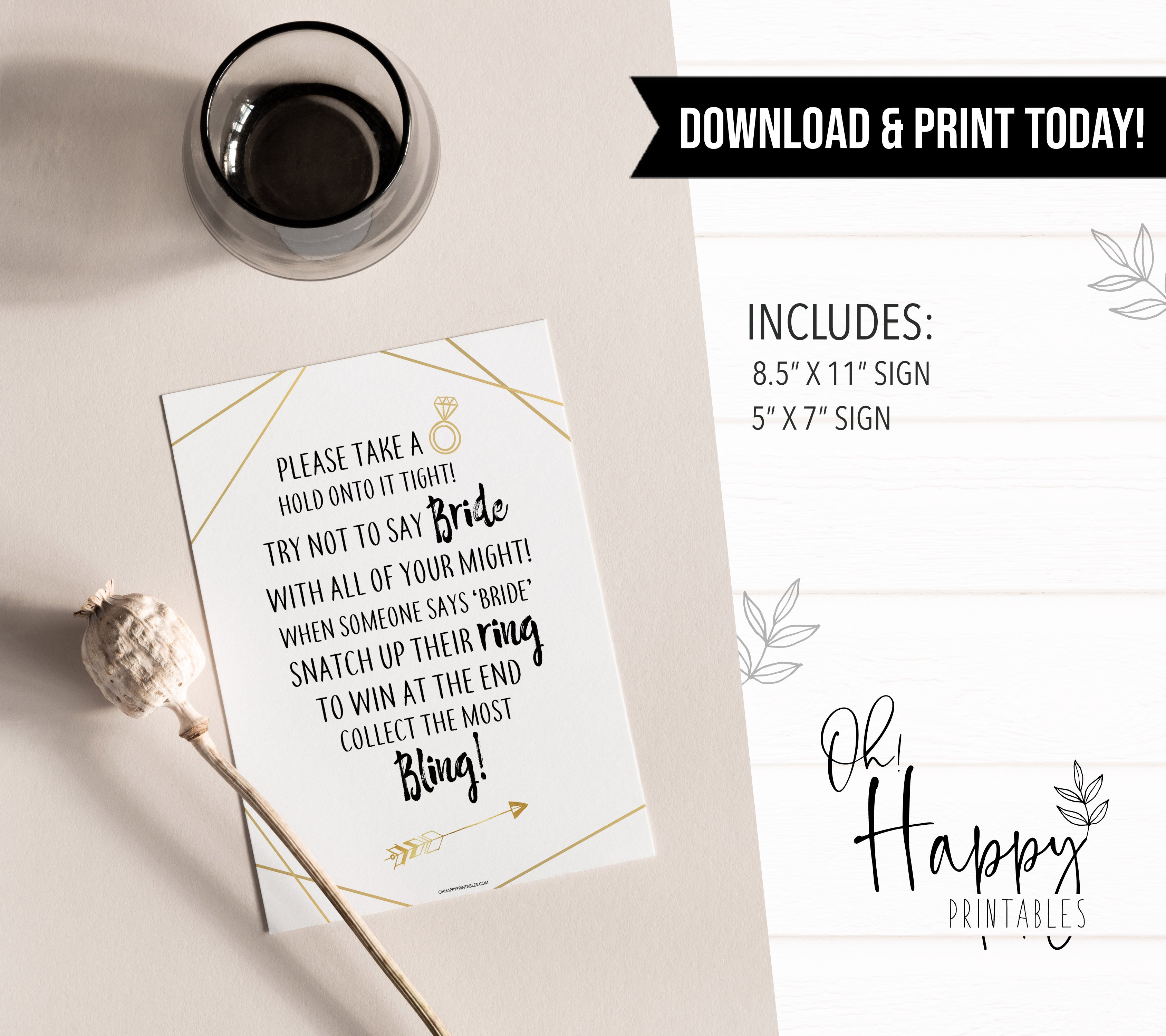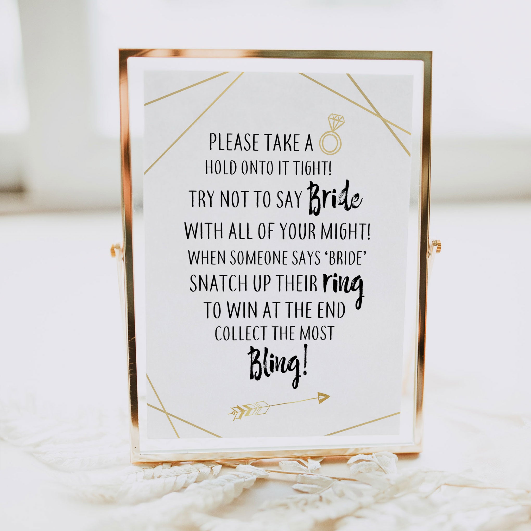 A bridal shower game that's perfect for big groups, add a bunch of rings to a pot. Everyone has to keep hold of their ring, but if someone catches them saying 'Bride' - they have to surrender their ring! It's a fun ice breaker game that gets everyone involved in the party. Simply download and print at home, it couldn't be easier.