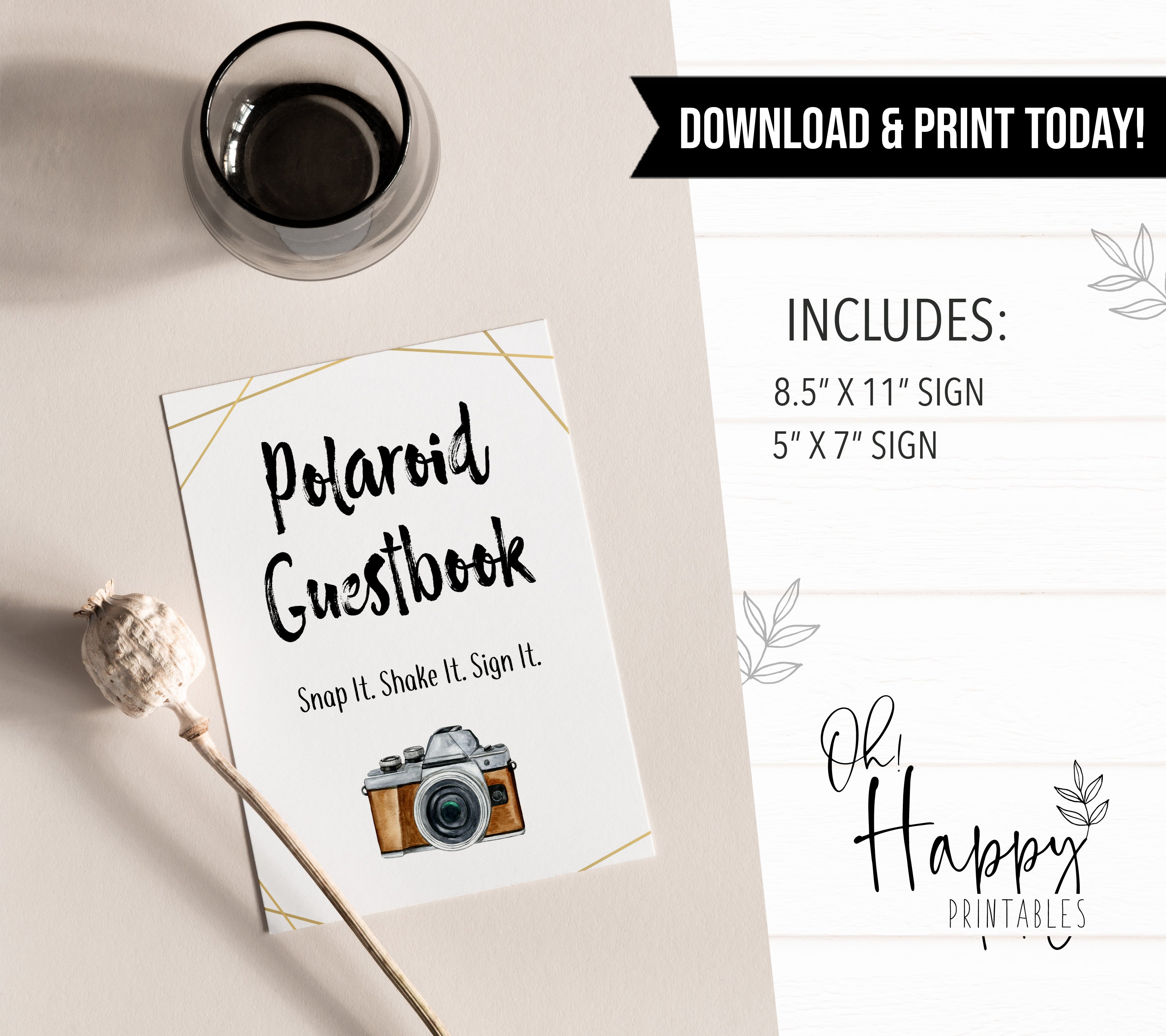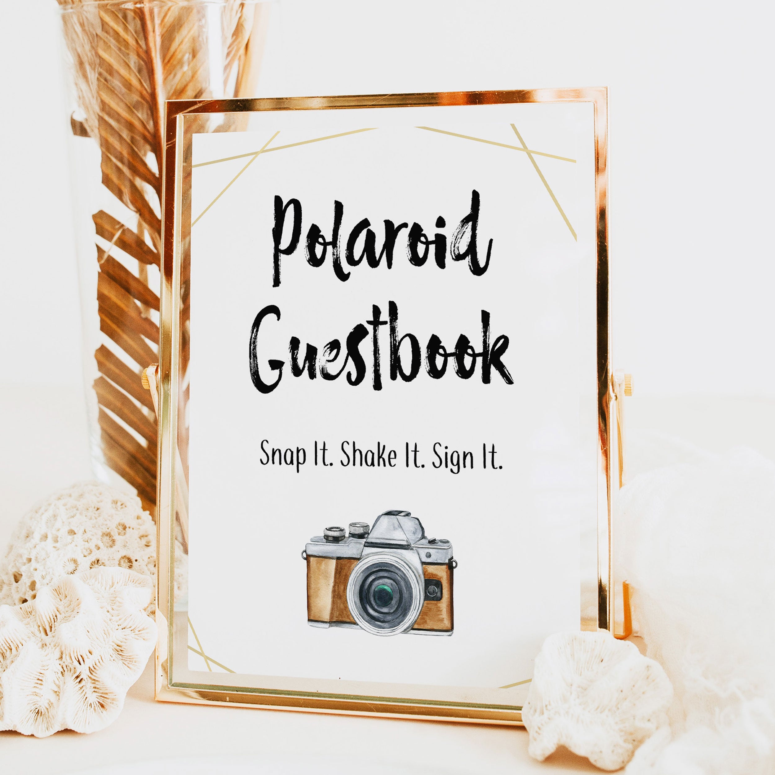 Snap it, shake it, and sign it! Polaroid guestbooks are a unique way to keep special memories alive of your big day. Get your guests to snap a photo of themselves, and you get to keep the photo as a memento. This cute table sign is perfect for putting into a frame for any table display. Download and print at home, it couldn't be easier.