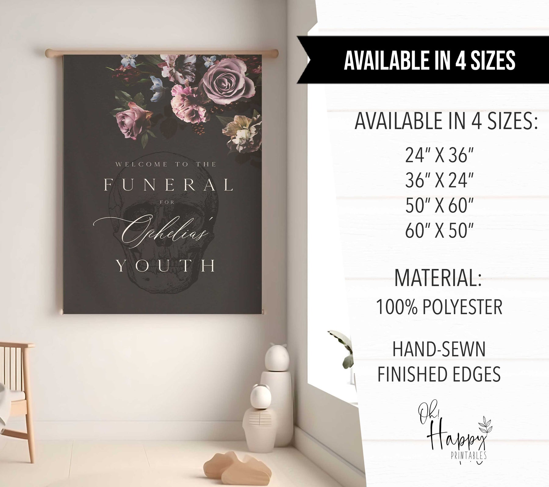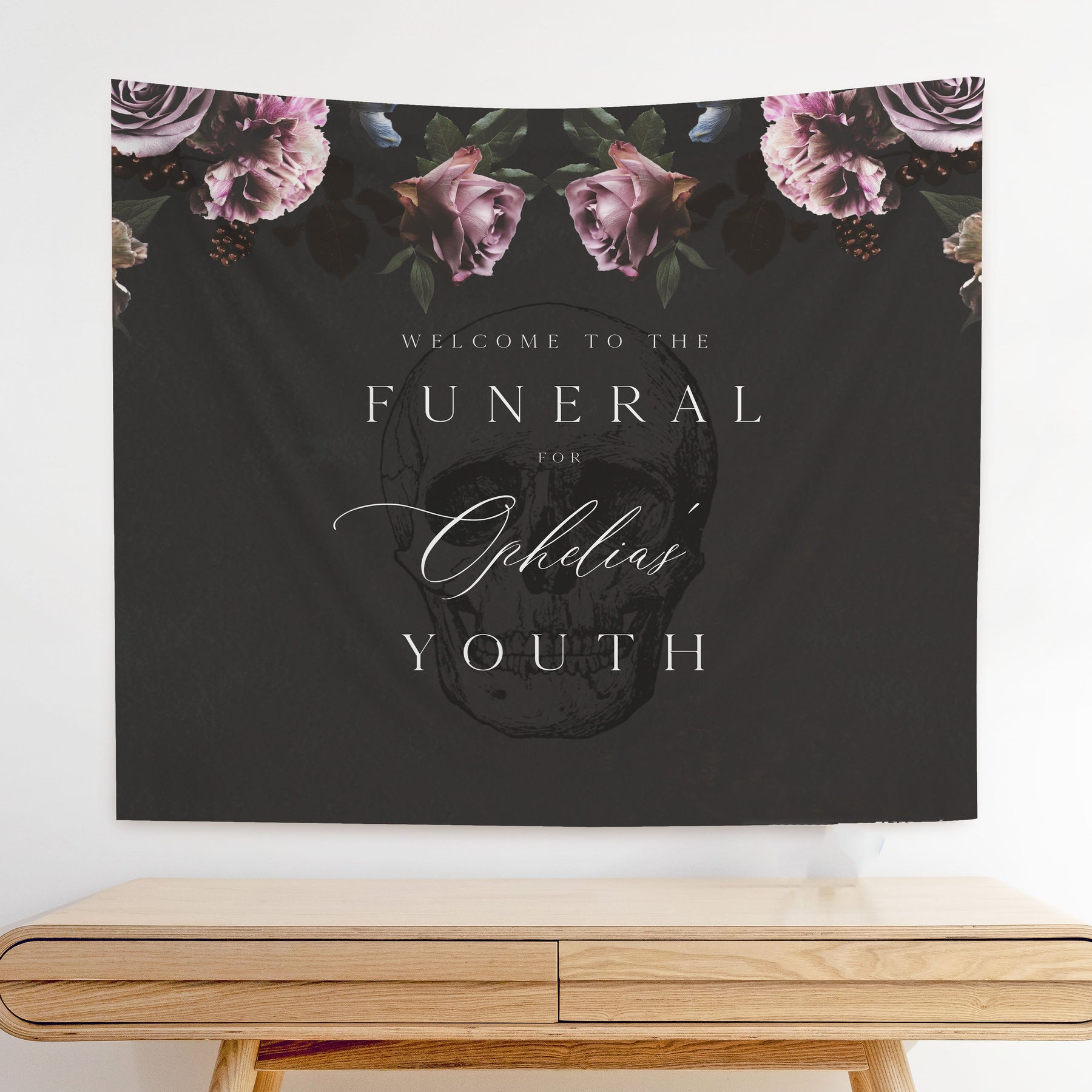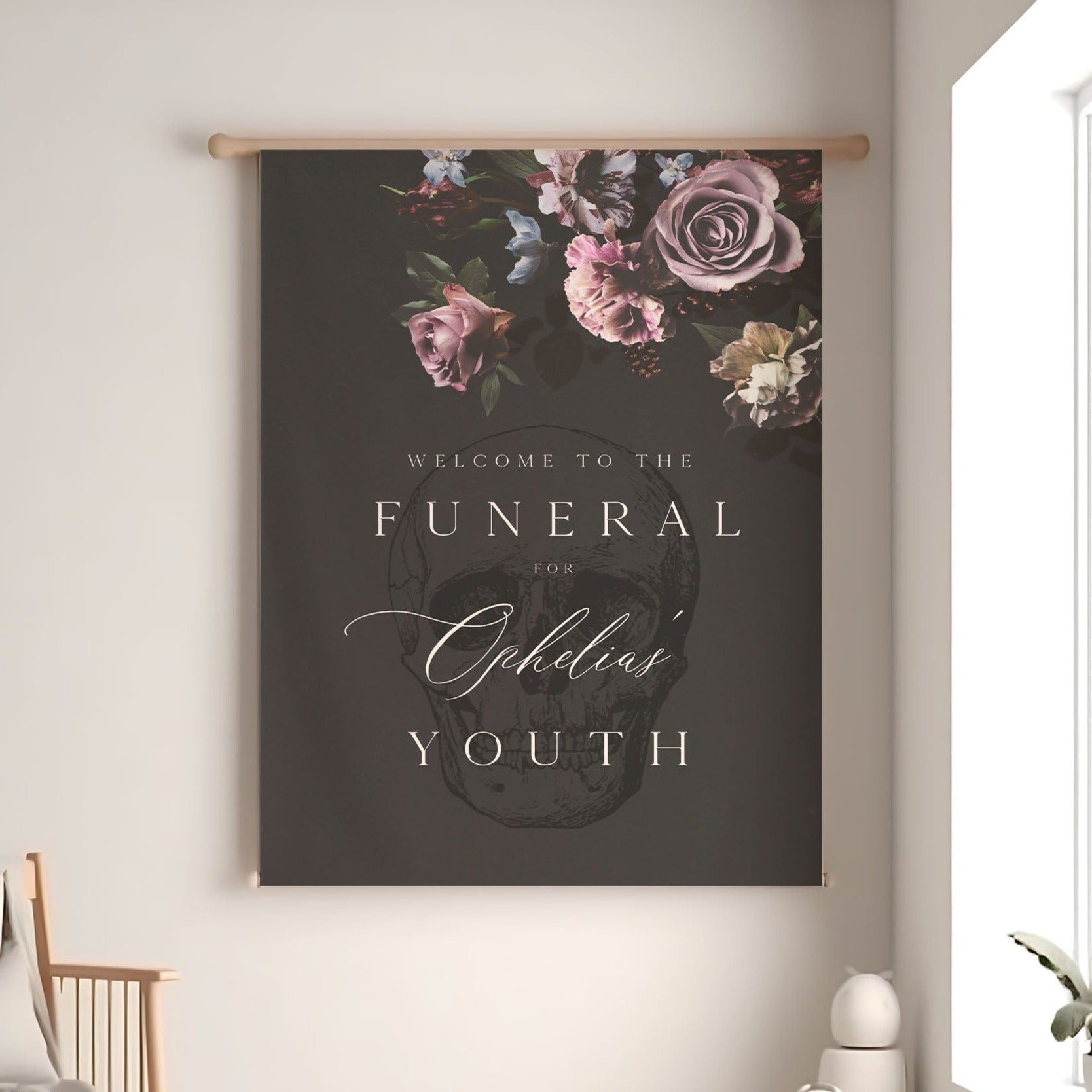 Introducing our Death To My 20s Backdrop, an exquisite fusion of gothic florals and striking skull motif, designed to commemorate the milestone of bidding farewell to your tumultuous twenties. This personalised masterpiece is crafted with meticulous attention to detail, ensuring a unique backdrop that reflects your individuality.