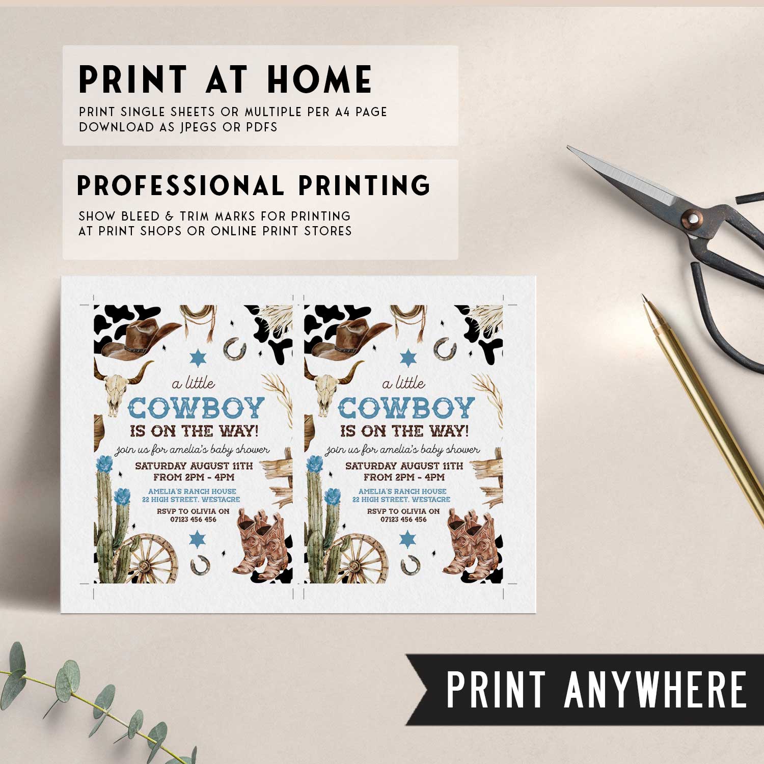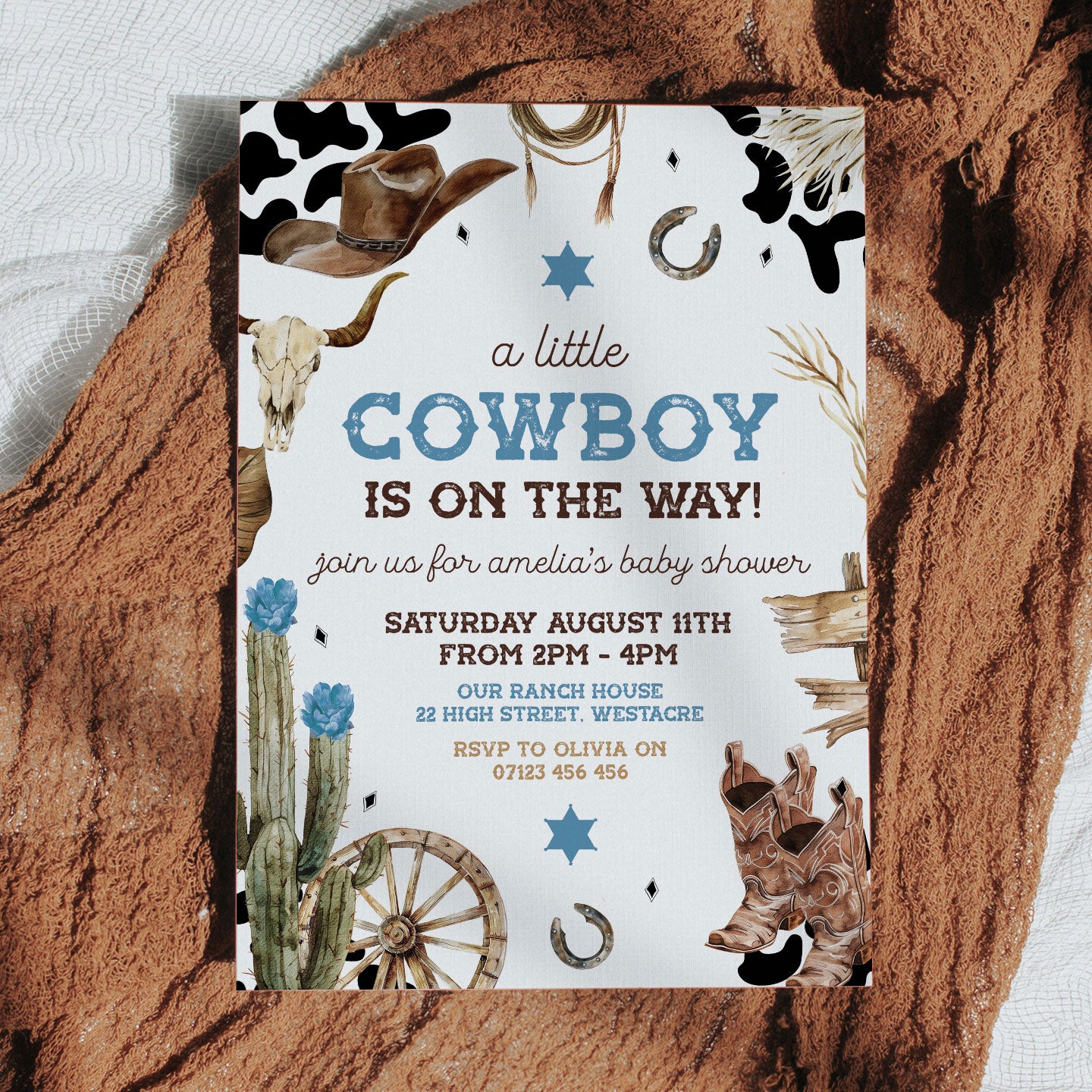 Introducing our 'A Little Cowboy' editable baby shower invitation set, designed to brighten up your special day. This set features both 5x7 invitation and a mobile-friendly version, enabling you to effortlessly share the joyful news with friends and family.
