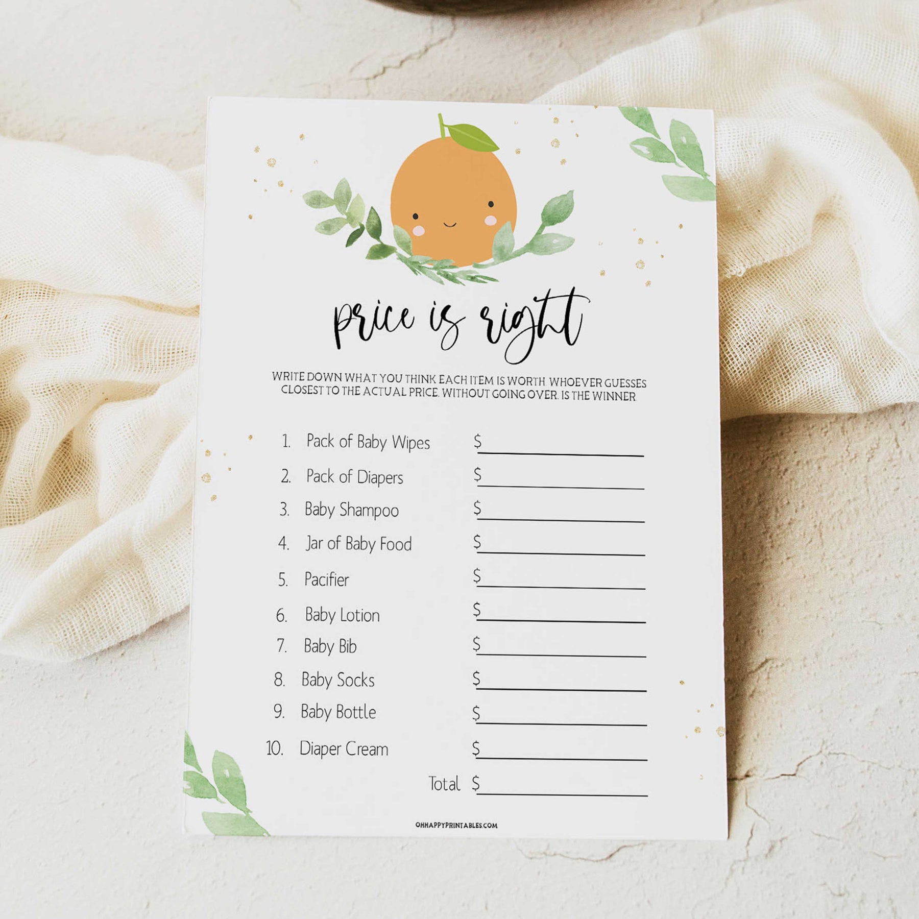 This Baby Shower Price is Right game contains 10 must have baby items. All the guests have to guess what the cost of each item was. The hostess purchases the items prior to the Baby Shower, keeping the receipt. With the products on display, guests fill out their cards and overall total. When everyone is finished, the hostess reveals the individual costs and total from the receipt. The one with the closest answer wins.