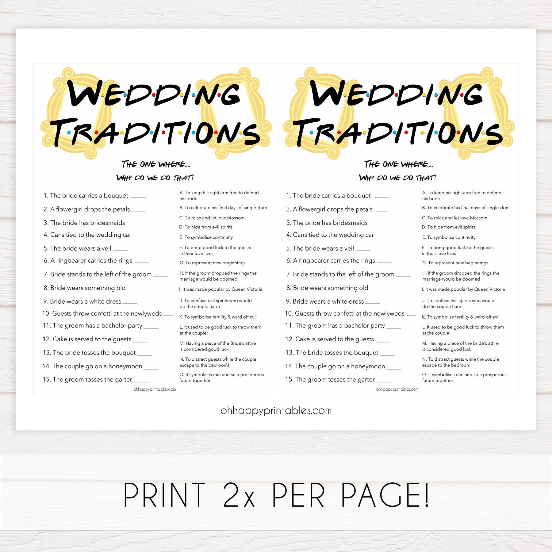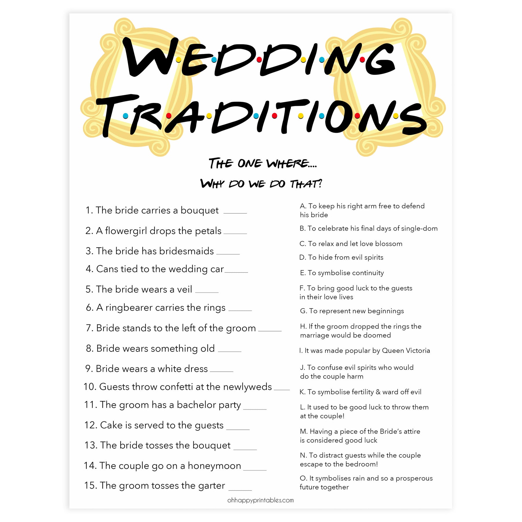 Do you know why we all throw confetti at a wedding? Or why the bride has a veil? Test your wedding knowledge with our Wedding Traditions - Why Do We Do That game. A fun bridal shower game that will get everyone thinking, and sheds some light on why you need something old and something new, something borrowed and something blue!