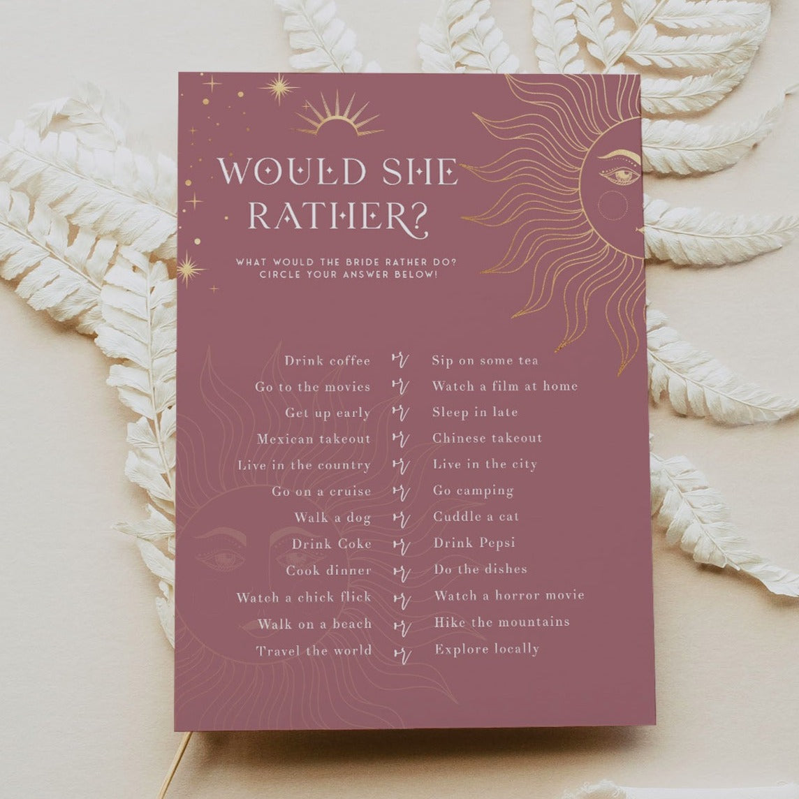 A fun Bridal Shower game that will test how well you all really know the bride! Simply circle the answer you think she'd prefer to do. Make it a Bridal Shower to remember with some fun and unique games that are fun for everyone to play.